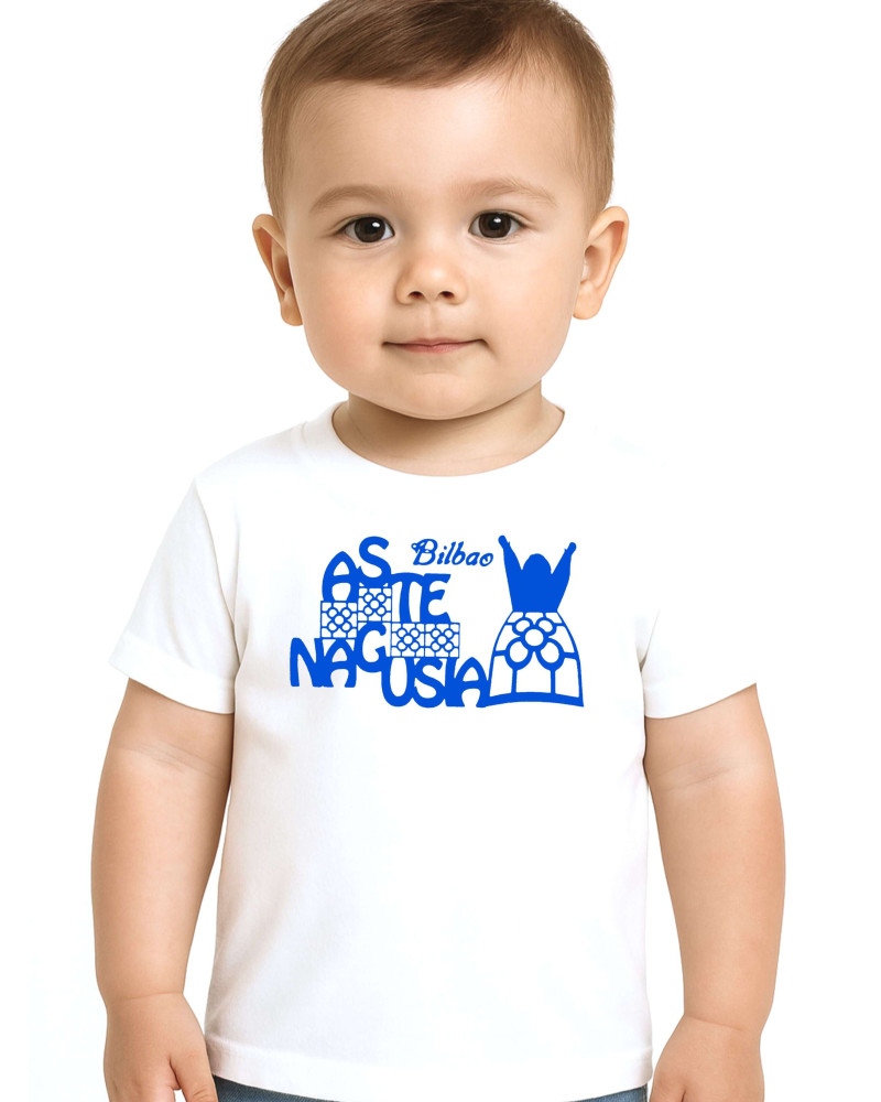 Esta camiseta con baldosa de Bilbao es el complemento ideal para acompañar nuestros conjuntos para fiestas de Bilbo. Completa tu traje de arratzale con esta camiseta para fiestas de Bilbao y el texto Aste Nagusi en azul. Con esta camiseta de mari jaia infantil llevaras completo tu conjunto de arrantzale en la semana grande de Bilbo.
