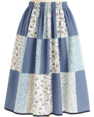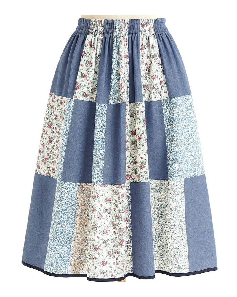 Falda de Baserritarra para mujer, es una falda de casera con estampado patchwork donde predomina el  color azul jaspeado.